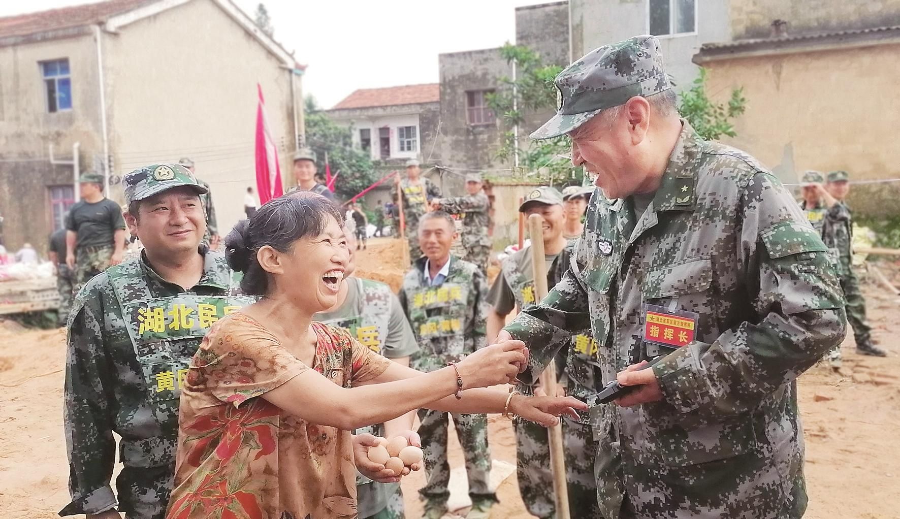 “我们开始给年轻的孩子们送,他们都不肯接。我看到一群人里面他的年纪大一些,我就上前跟他说,你们辛苦了,给他塞了两个鸡蛋。他当时很和气,跟我握手,还笑着说不辛苦,这是他们应该做的。”胡良花说,虽然她不知道这位首长的名字,也不知道他们是哪个部队的,但是她想向所有穿迷彩服的官兵们说一句:“你们辛苦了!”