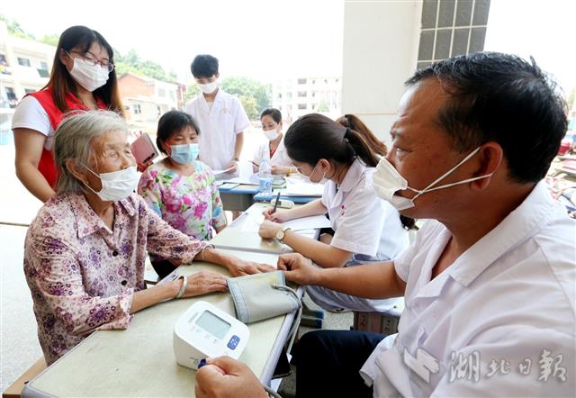 7月14日,阳新县医院医护人员在排市镇中心小学集中安置点,热情为受灾群众体检身体。该县排市镇受洪水影响受灾严重,536名受灾群众被集中妥善安置,专班人员保障他们有地方住、有热饭菜吃、有干净水喝、有病能治疗,保证了受灾群众的基本生活质量,目前群众情绪稳定。(湖北日报全媒记者 张鸿 通讯员 江显平 柯磊 摄)