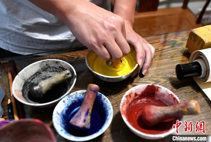说话间,他一手拿着颜料,一手用画笔勾勒线条。神像画颜料的调制十分讲究,先将文石、伊利石、孔雀石等矿石研磨成粉末状,用祖上秘传的独特手法加胶调配揉磨加工,再进行调制,可以保证神像画的色彩历久弥新、光泽不退。