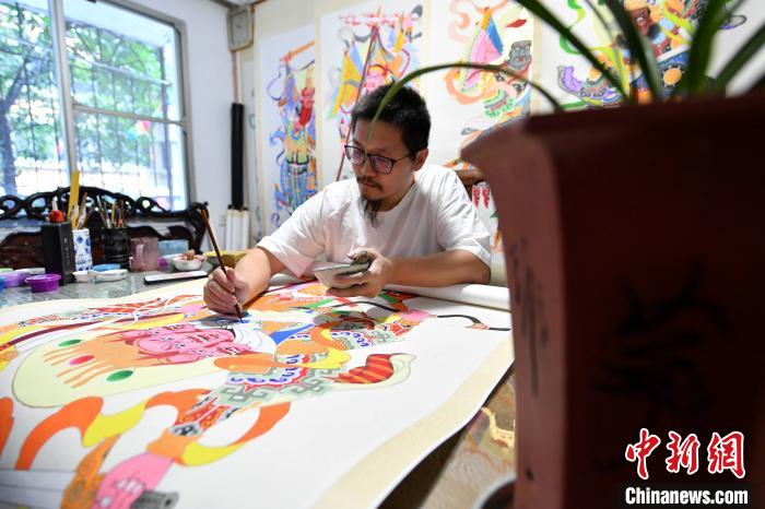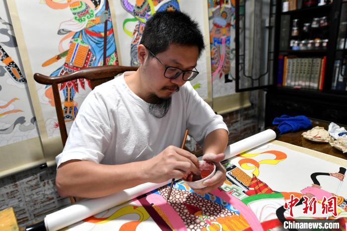 中新网福州7月15日电 (叶秋云 张淋垣)画笔轻蘸赭石色颜料,顺着原有的线条一笔一画慢慢勾勒、填充……7月15日,在“80后”福州市非物质文化遗产“李道环神像画”第四代传承人李真的工作室内,他正在为《天猷元帅像》复勾线条,落笔成像。