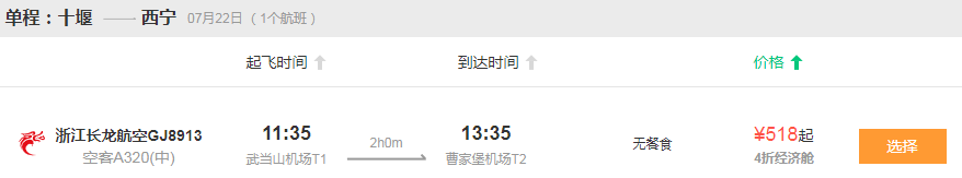 珠海到十堰:12:55起飞15:15抵达十堰到珠海:16:00起飞18:20抵达