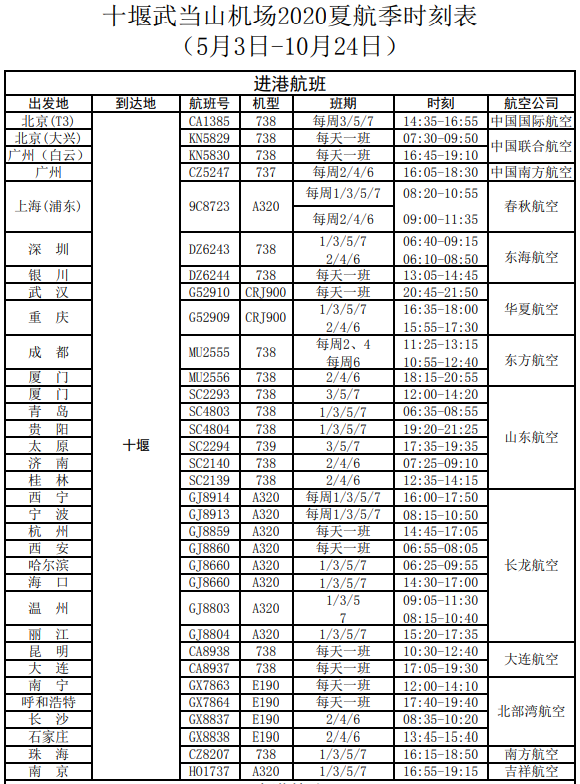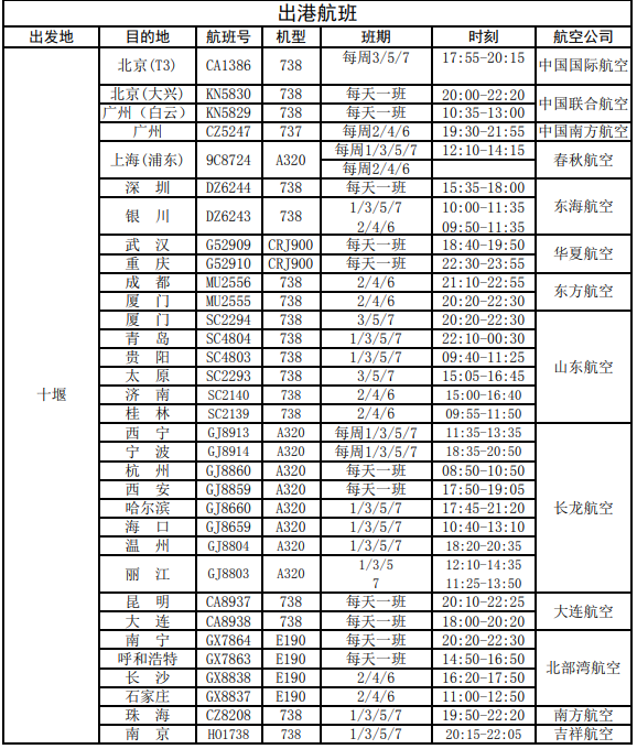 珠海—十堰:16:15起飞18:50抵达十堰—珠海:19:50起飞22:20抵达