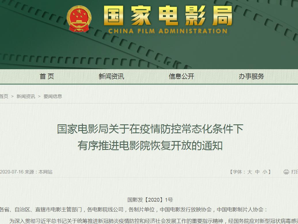 各省、自治区、直辖市电影主管部门,各电影院线公司,各制片单位,中国电影发行放映协会,中国电影制片人协会:为深入贯彻习近平总书记关于统筹推进新冠肺炎疫情防控和经济社会发展工作的重要指示精神,经国务院应对新型冠状病毒感染肺炎疫情联防联控机制同意,现就在疫情防控常态化条件下有序推进电影院恢复开放通知如下。