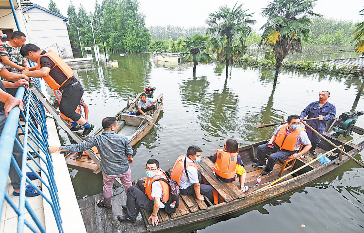 7月16日8点半,41岁的天兴乡党委委员、武装部长傅建军擎旗行船。此前,他已连续坚守4天,只回家暂休一夜便再度驰援。