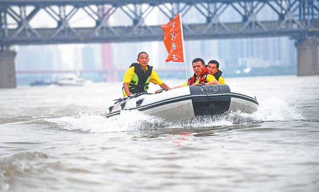 武汉晚报讯 16日上午,小雨后的武昌江滩空气中满是水汽,一艘冲锋舟从武昌江滩出发,巡视江面,船尾“长江救援志愿队”的旗子迎风飘扬。从4月8日武汉重启至今,队员们巡视江面值守江岸,保障市民生命安全。看着街面上的行人车辆由少变多,也看着汛期的江水从上涨到回落,英雄的城市连战疫情汛情,他们是见证者,也是参与者。
