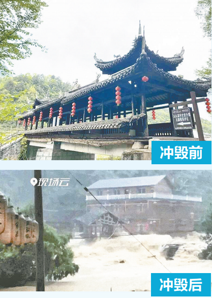 6月13日上午,在凶猛的洪水中,马头溪风雨桥轰然垮塌,随后被冲走,只剩下桥墩。