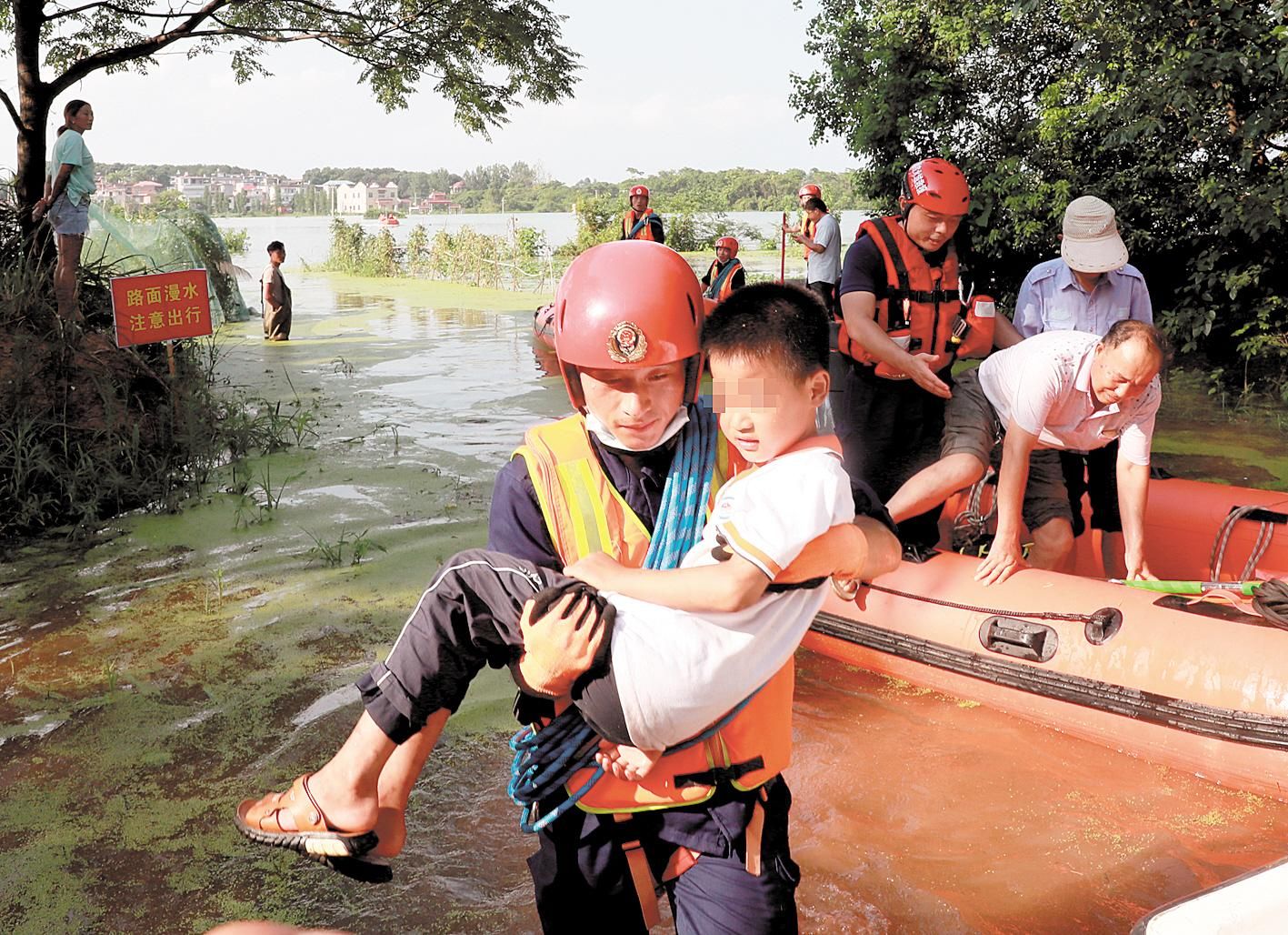 7月14日,在江西省都昌县西源乡东湖村,湖北消防指战员正在转移被困群众。 (湖北日报通讯员 鄂消宣 摄)