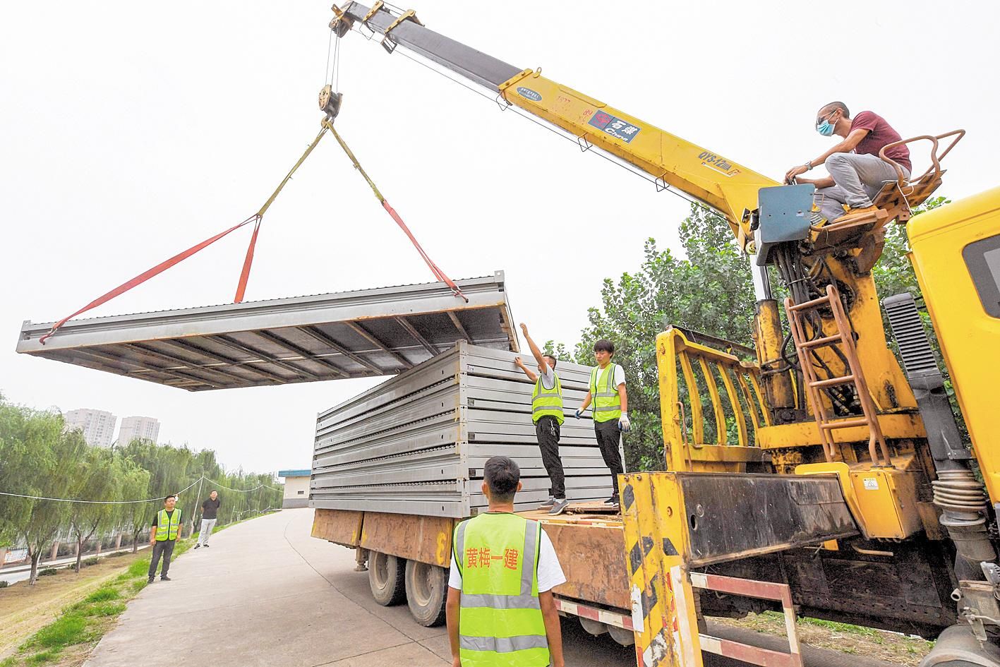 7月15日,黄梅县施工人员在黄广大堤小池段吊装可折叠的移动厢房,一张18平方米的钢构平板,在短短10分钟之内就变成了一个哨棚。黄梅县城发集团介绍,这些可折叠的移动厢房是黄梅县在抗疫期间建设方舱医院剩下的,共有148个,目前已在江堤和圩堤上吊装120多个。