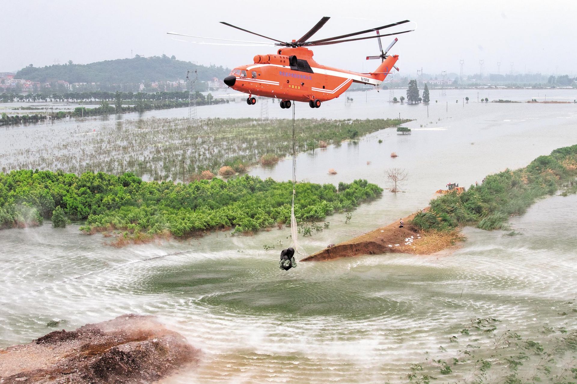 7月16日,一架米-26直升机在阳新县富河干堤葵赛湖下垸上空投网兜石块封堵溃口。7月9日,这里出现一处溃口,逐渐扩大至40米,溃口处通往附近106国道的1公里路段为河堤,路面窄、路基软,大型机械设备和工程车辆无法抵达,抢险施工难度较大,省应急管理厅紧急调度3架直升机,参与空投网兜石块封堵。