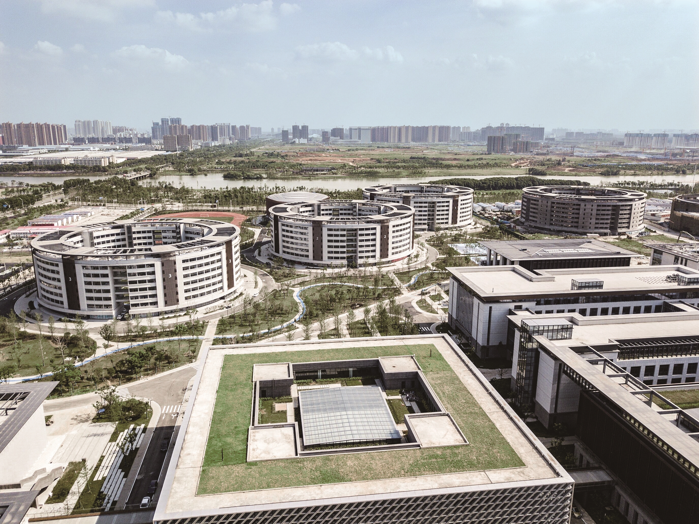 摄影爱好者李翔,一番娴熟操作,无人机飞向空中。从监视器看到,一片绿荫中,宽敞的金山大道穿湖而过,写字高楼鳞次栉比。