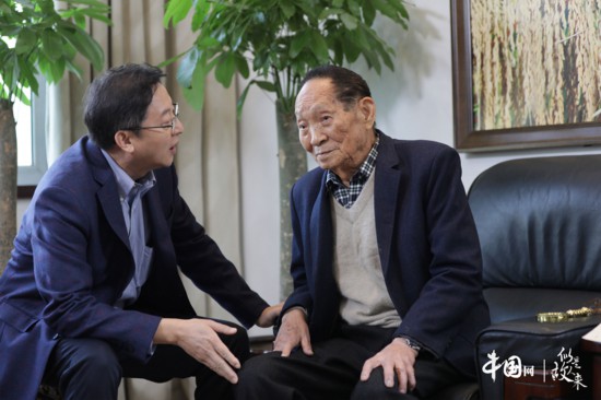 中国网总编辑王晓辉(左)对话共和国勋章获得者袁隆平(右)