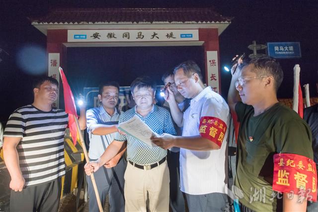 7月16日晚,黄梅县纪委监委监督员在刘佐乡滨江村检查巡堤查险情况。滨江村地处鄂、皖、赣三省交界处,黄广大堤与安徽省铜马大堤在这里连接。黄梅县纪检监察机关将监督执纪关卡前移到抗洪抢险第一线,3个监督检查组24小时驻扎在长江干堤,白天巡查、晚上暗访,督促党员干部将防汛工作各项决策部署落到实处。截至目前,黄梅县纪检监察机关共出动468人次对重点部位防汛备汛况进行监督检查,发现问题143个,印发反面通报8期,表扬通报1期,立案查处5人,组织处理105人。(湖北日报全媒记者 陈勇 王政 摄)
