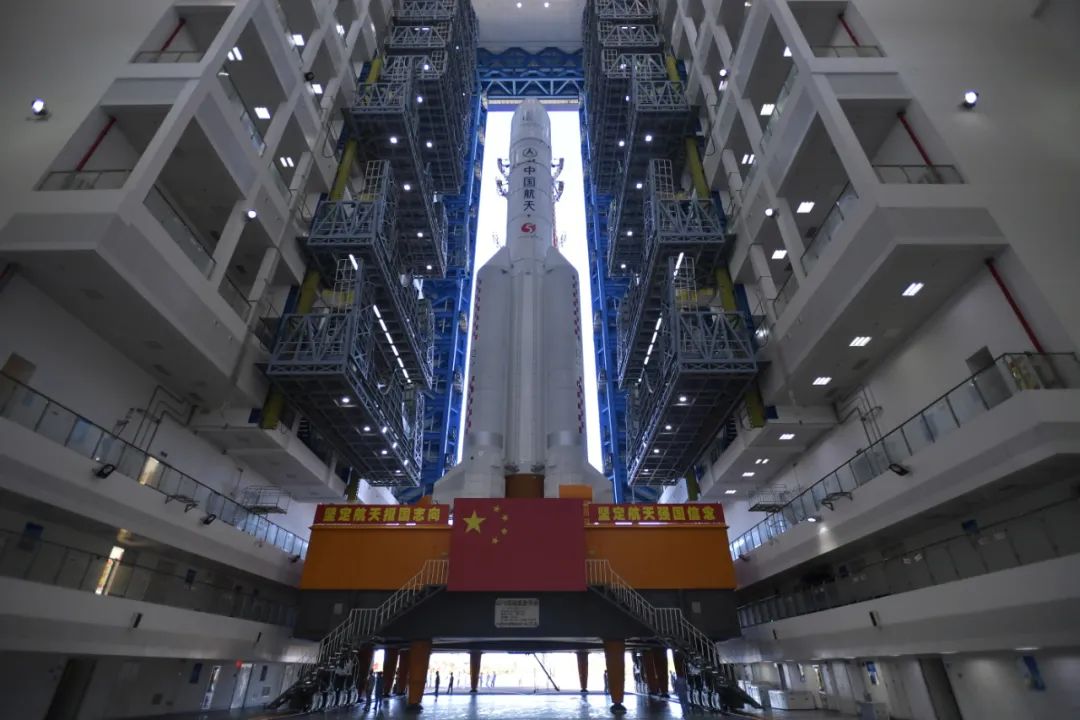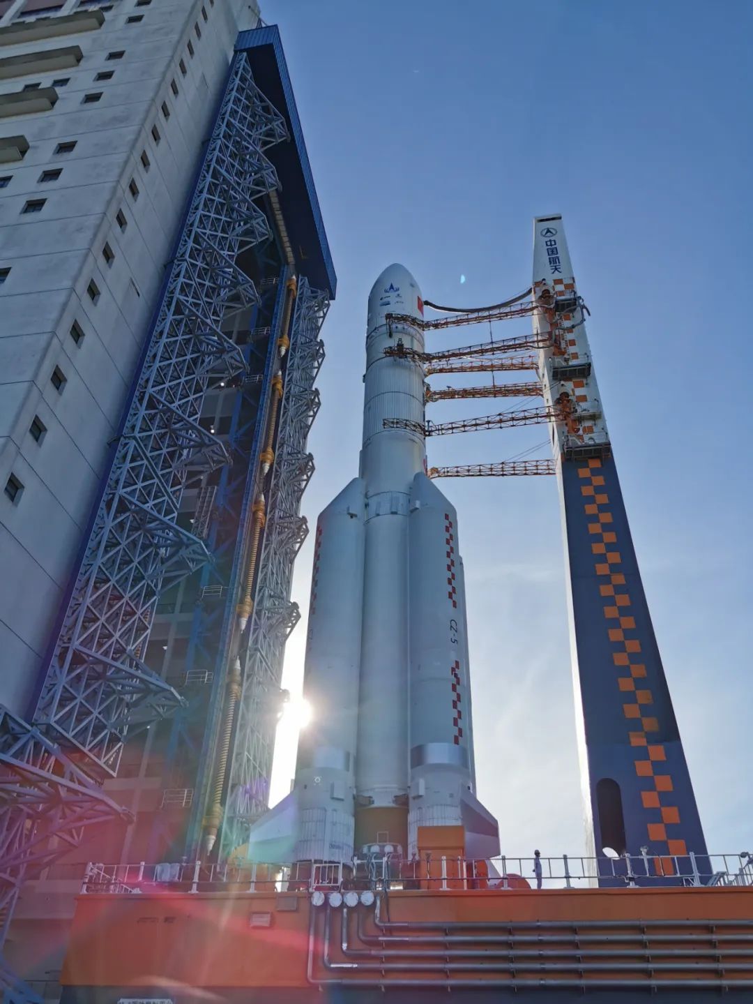 7月17日上午,执行此次任务的长征五号遥四运载火箭,已垂直转运至发射区。