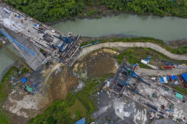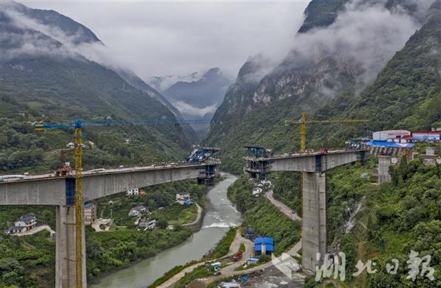 7月16日,郑万高铁兴山段南阳河双线特大桥施工现场激战正酣,施工人员在云雾升腾的山峦中冲刺大桥合龙目标。该桥全长565.798米,预计今年10月31日全桥合龙。目前正是项目施工的关键时期。郑万高铁是郑渝铁路的重要组成部分,郑万高铁兴山段23个作业面已完成11个,预计2021年底全线通车。(湖北日报全媒记者 刘曙松 通讯员 邹远景 乔长娇 摄)