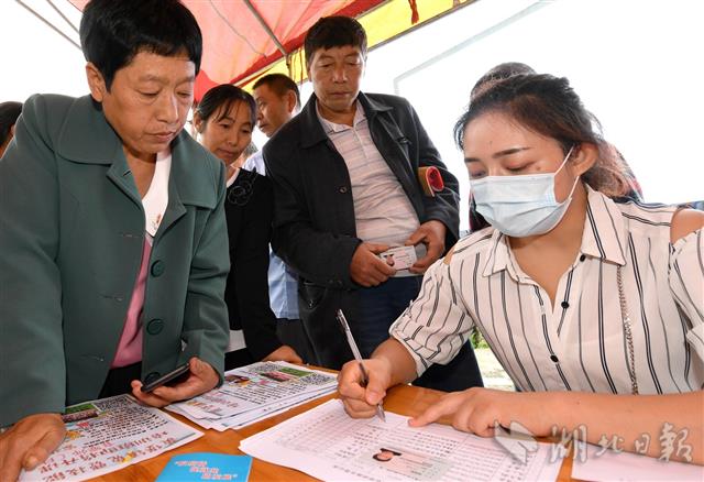 7月16日,在保康县两峪乡就业扶贫专场招聘会上,“就业红娘”为求职者发放招聘信息资料。