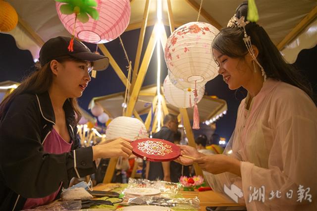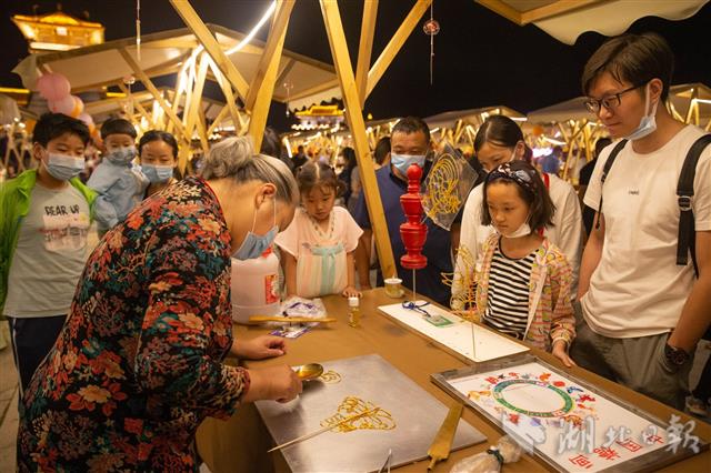 7月16日,游人在襄阳唐城市集上观看糖画制作。当晚,“襄城八点半”唐城市集正式开市,这一以古风创意市集将进一步满足游客的购物需求,持续释放襄阳古城夜经济活力。日前,襄阳市推出“襄城八点半”夜经济品牌活动,先后举办了“北街八点半”“檀溪夜市八点半”等。借助“襄城八点半”活动品牌,从6月6日起,襄阳唐城景区恢复“盛世唐城之大唐倚梦”夜游表演项目,促进外地游客变“一日游”为“过夜游”。(视界网 杨东 摄)
