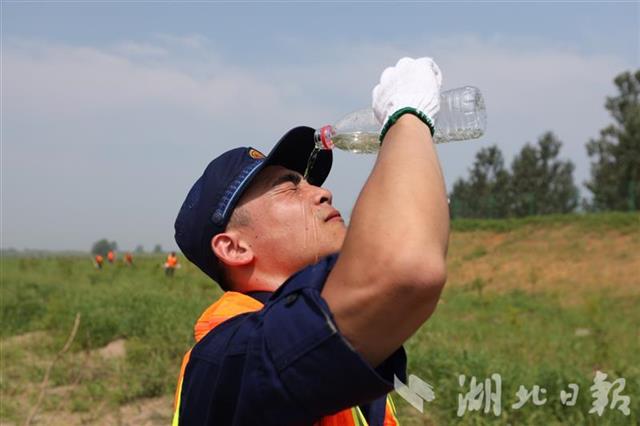 突击队的任务是在外堤坝底找出积水坑,并用沙土进行填埋。9时起,天空突然放晴,气温快速攀升,一下子到了38度。突击队员们头顶烈日,挥汗如雨。截至12时,突击队共完成约3.5公里外堤填埋夯实和修整,填埋外堤坝积水坑约800个。