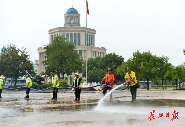 17日上午,汉口江滩组织清洁队伍,对江水退却后的园区冲洗保洁。 记者喻志勇 通讯员 向丽华 摄