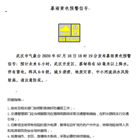 武汉市气象台2020年7月18日18时19分发布暴雨黄色预警:预计未来6小时,武汉开发区、蔡甸将有50毫米以上降水,伴有雷电,阵风6-8级,城乡渍涝、地质灾害、中小河流洪水风险较高,请注意防范。