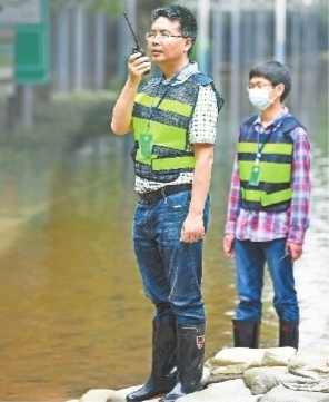 李振(左)和同事在巡堤。