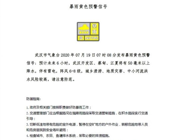【19日7时08分】武汉市气象台发布暴雨黄色预警信号: