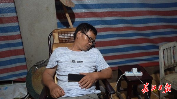 南湖村一名生产队队长守堤之后在椅子上睡着了。记者胡胜 摄