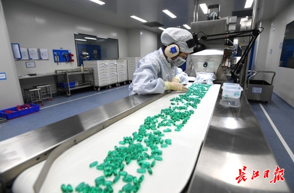 人福普克药业(武汉)有限公司,工人在后处理工序生产线工作。 记者高勇 摄
