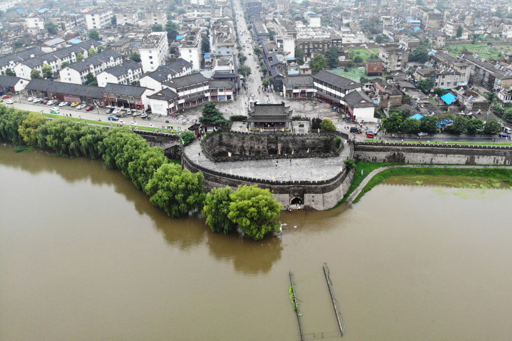 受近日强降雨影响,安徽省寿县古城护城河河水暴涨,为防止河水倒灌进城内,寿县防汛抗旱指挥部决定从7月18日12时起封堵县城宾阳门。(来源:新华社)