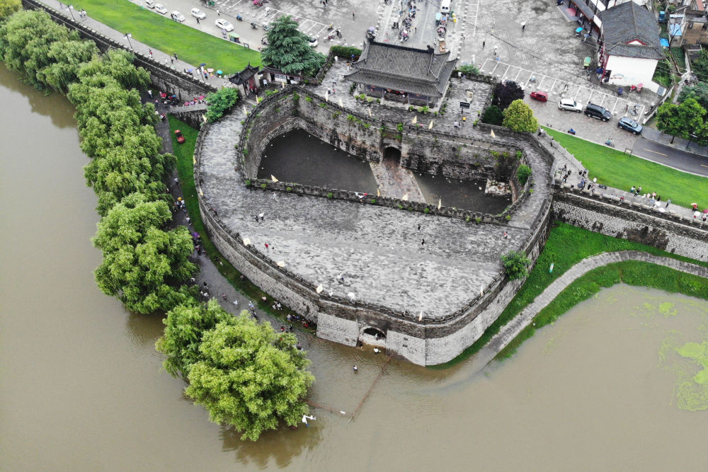 城市防洪在古代备受关注,筑城墙成了古人防御洪水的重要方法。据专家考证,寿县古城墙年代上限或可追溯到战国时期,并历经汉、唐宋、明清、民国多个时期的修缮和使用,以致今日的状况。图为无人机拍摄的寿县县城宾阳门