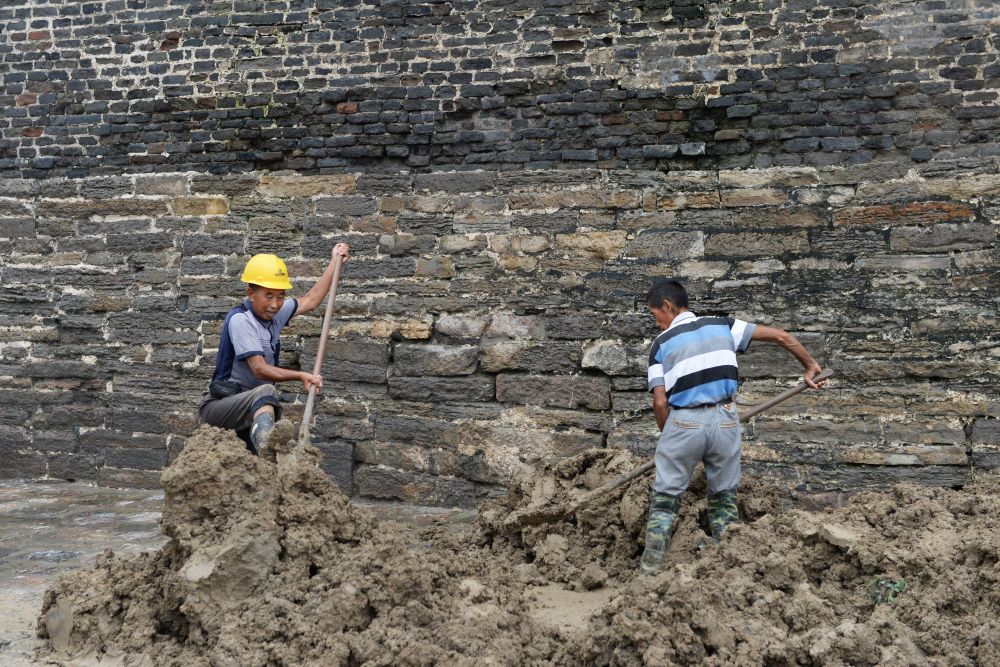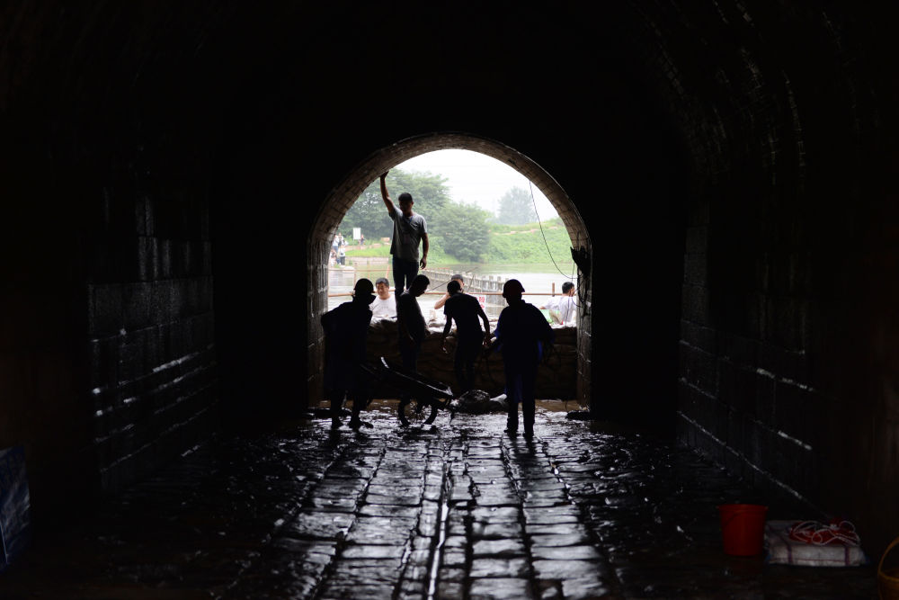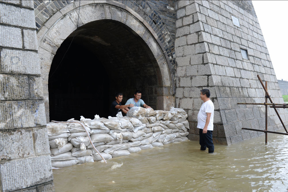 寿县古城宾阳门与瓮城内门不在一条线上,这种巧妙的设计,除了古代军事防御上的考虑,一个重要作用就是防洪。如果洪水冲破外门进入瓮城,会因为这种设计转变流向,从而减小对内门的冲击力。图为防汛人员装填泥袋,准备封堵寿县县城宾阳门。