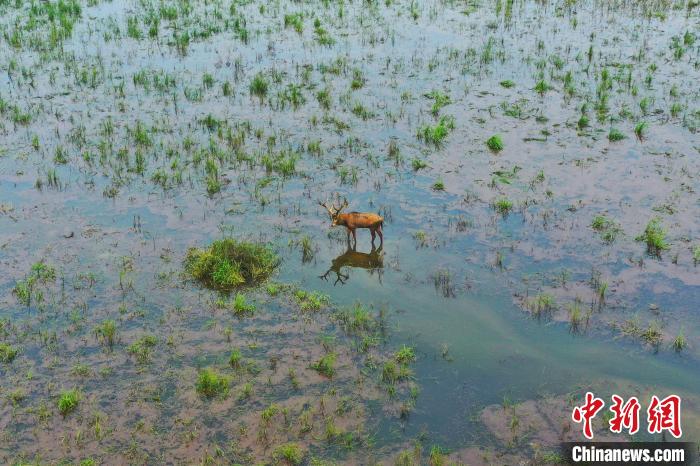记者18日在保护区内看到,不少地势低洼处被淹没,由于部分道路因积水无法通行,记者只能通过航拍镜头看到,鹿群在一些尚未淹没的浅滩休息觅食。