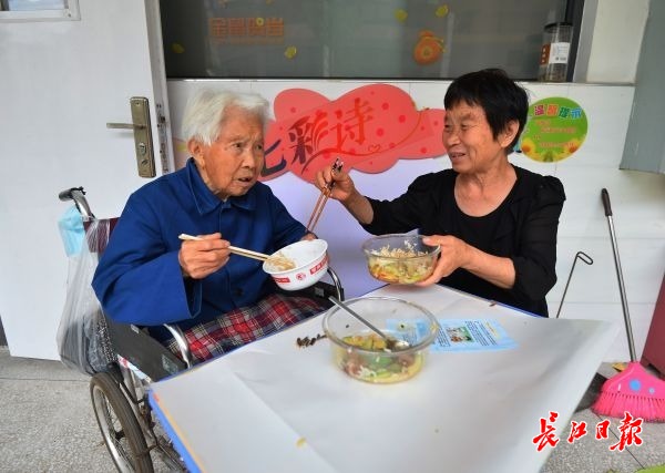 71岁的方春珍陪着95岁的婆婆苏顺英吃午饭。记者喻志勇 摄