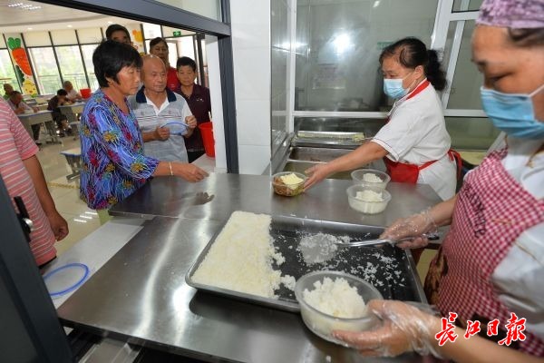 开饭时间老人们排队打饭。记者喻志勇 摄