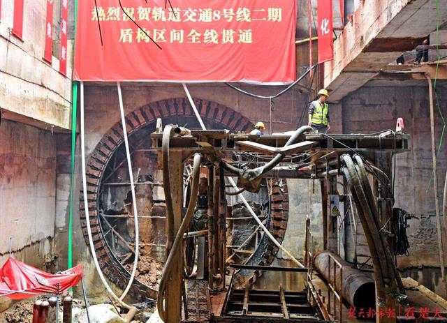 就在11号线葛店段贯通的同一天下午,武汉地铁8号线二期洪山路站—小洪山站区间,被称为“地老虎”的盾构机在嗡嗡声中探出头来,标志着地铁8号线二期隧道全线贯通。同一天,武汉地铁两条隧道先后贯通。