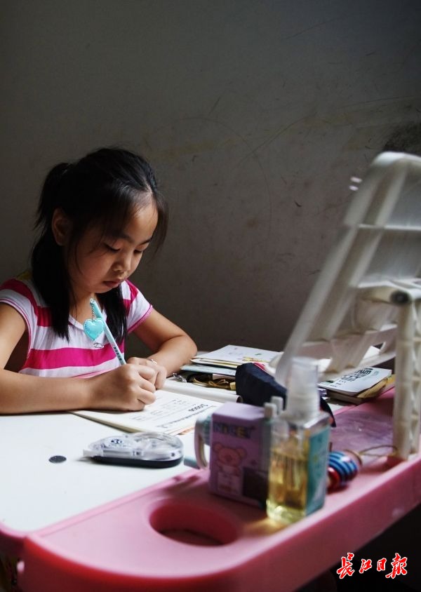 安置点内小学三年级的袁颖在写暑假作业。记者何晓刚 摄