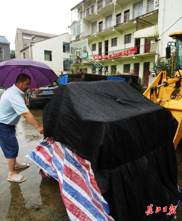 曹学习在检查机械设备是否淋雨。记者何晓刚 摄