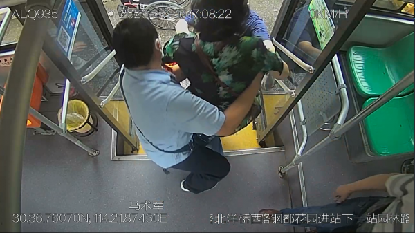 武汉公交709路随车安全员陈宏军帮着搬轮椅上车(视频截图)