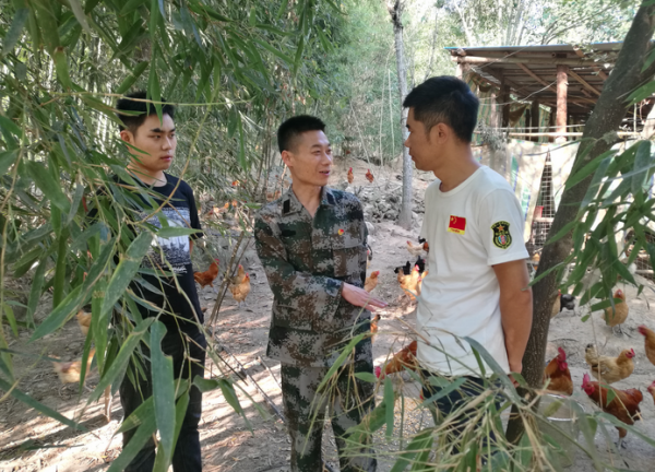 朱铭(中)和退役军人合伙人交流土鸡养殖。