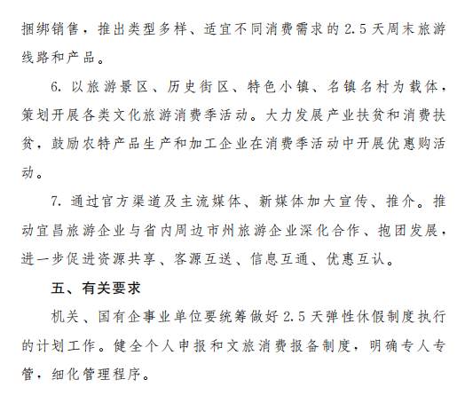 7月20日,据宜昌发布微信公号,日前,湖北宜昌市人民政府办公室印发《宜昌市实行2.5天弹性休假制度实施方案(试行)》的通知。《通知》明确,为促进文化旅游业恢复重振,市委、市政府决定实行2.5天弹性休假制度。方案如下: