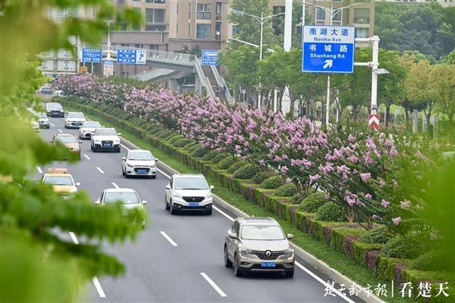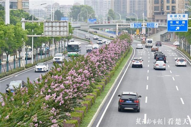 近一个半月来,一波波雨水接连袭扰,江城武汉天际蒙上灰色调,幸有彩花与伴,点亮你我的生活。前两天,有市民惊喜地发现洪山区珞狮南路蓬勃绽放了一段紫薇花径,“堵车在此,也是一种幸福啊。”