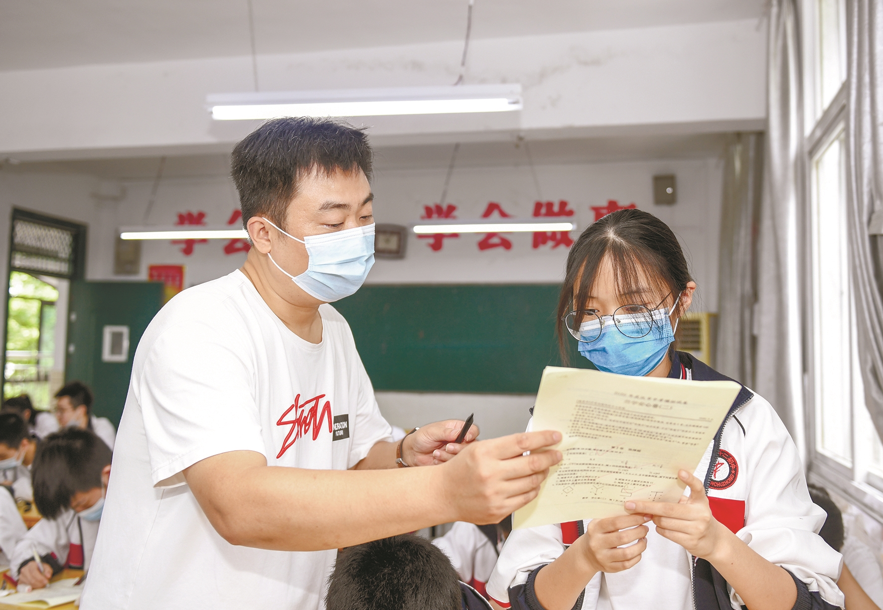 起初,鉴于徐伟的身体情况,学校准备将他调整到相对轻松一些的岗位,可徐伟却坚持一定要继续站在讲台上。虽然身患重症,但他的教学功底扎实,教学业绩突出。2018年中考,他所带的班级有45名学生,其中有40人过普高线,10人被武汉一中录取。目前,他担任初二(7)班的数学老师和班主任。今年6月,因为初三年级一名数学老师生病,他又主动承担起初三(3)班的数学课。