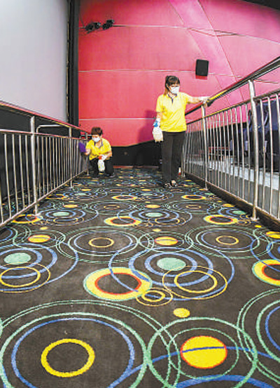 19日,工作人员在河北遵化一家电影院进行消毒。刘满仓摄(人民视觉)