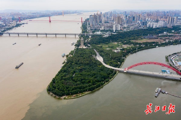 2020年7月12日10时,长江武汉关水位已达28.68米,排在历史最高水位的第四位。从空中俯瞰南岸嘴,江水涛涛。记者胡冬冬 摄
