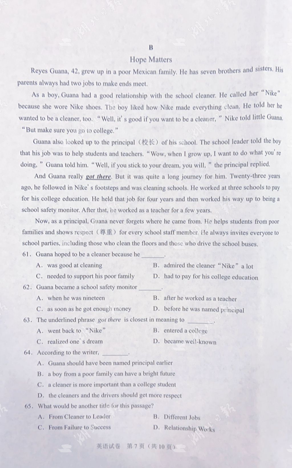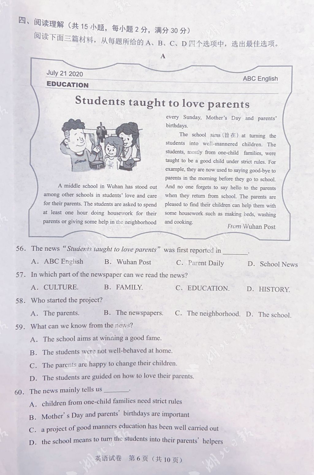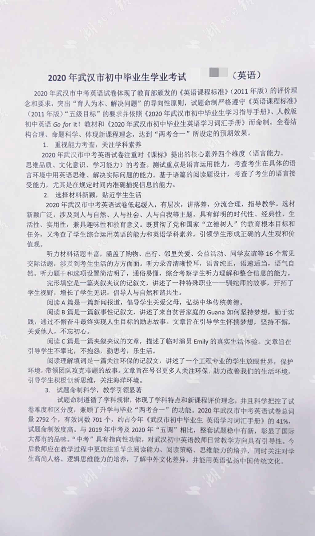 湖北日报讯(记者朱惠、通讯员邹永宁)7月21日16:30,随着最后一科英语考试结束的铃声,武汉2020年中考顺利收官。武汉市招考办第一时间发布中考语文、数学、英语、理化、道德与法治试卷、参考答案,以及试题说明。