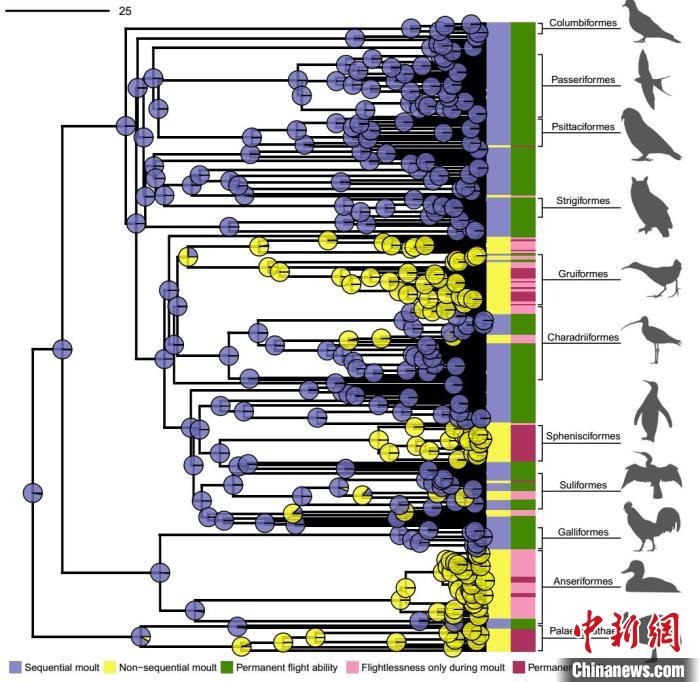 中以科学家此次合作研究结合双方现生和灭绝物种数据开展功能演化分析研究的优势,采用祖先状态特征分析的研究方法,基于一个由302个现生鸟类构成的数据集,对鸟类换羽的演化历程进行宏观演化分析。研究发现,现生鸟类的最近祖先是以顺序换羽模式进行换羽,其最早的顺序换羽行为至少在7000万年前就已出现,现生鸟类几个演化分支是后来独立演化非顺序换羽的。同时,该研究也支持前人基于对现生鸟类观察得到的假说,顺序换羽模式可以使得鸟类在换羽期依旧保持飞行能力的,同时换羽模式的鸟类在换羽期一般不能飞行,或者本身就已经丧失了飞行能力。