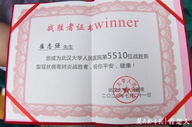 欢送会上,马旭东为崔志强颁发了编号为“5510”的“战胜者证书”,祝贺他康复出院。崔志强也是武汉大学人民医院抗疫期间收治的所有5510名住院患者中,最后一名出院病人。