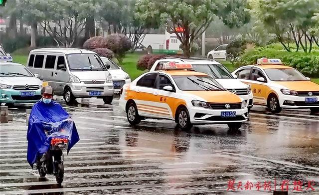 上午9点多钟,在汉口发展大道过往车辆、电动车、行人,都在雨中慢行
