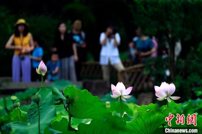 资料图:荷塘内美丽的荷花吸引游客争相拍照。 汤彦俊 摄