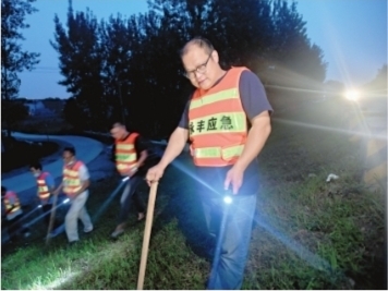 5名队员排成一列,在手电光的照射下,借助竹竿查探水情,虽然是人生首次上堤防汛,但贺立军一招一式都显得很老到,而他将“手艺”的炼就归功于有个好师傅。