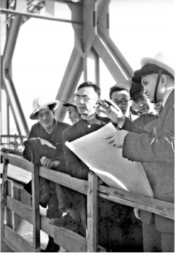 唐寰澄(左三)与苏联专家在武汉长江大桥上。